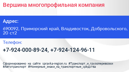 Вершина, многопрофильная компания по адресу 690092, Приморский край, Владивосток, Добровольского, 20 ст2 в дальнейшем Организация, размещена в следующих категориях: