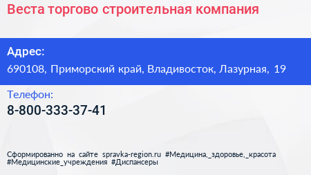 Веста, торгово-строительная компания по адресу 690108, Приморский край, Владивосток, Лазурная, 19 в дальнейшем Организация, размещена в следующих категориях: