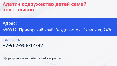 Алатин, содружество детей семей алкоголиков по адресу 690012, Приморский край, Владивосток, Калинина, 243г в дальнейшем Организация, размещена в следующих категориях: