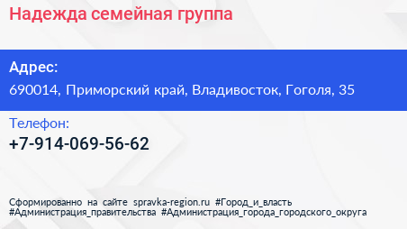 Надежда, семейная группа по адресу 690014, Приморский край, Владивосток, Гоголя, 35 в дальнейшем Организация, размещена в следующих категориях: