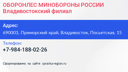 ОБОРОНЛЕС МИНОБОРОНЫ РОССИИ, Владивостокский филиал по адресу 690003, Приморский край, Владивосток, Посьетская, 15 в дальнейшем Организация, размещена в следующих категориях: