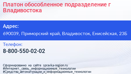 Платон, обособленное подразделение г. Владивостока по адресу 690039, Приморский край, Владивосток, Енисейская, 23Б в дальнейшем Организация, размещена в следующих категориях: