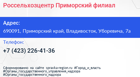 Россельхозцентр, Приморский филиал по адресу 690091, Приморский край, Владивосток, Уборевича, 7а в дальнейшем Организация, размещена в следующих категориях: