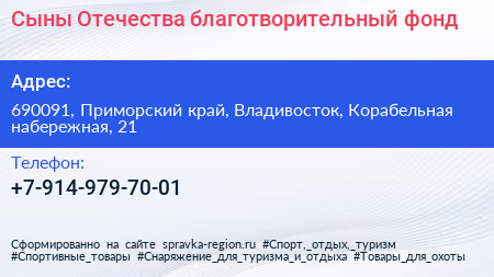Сыны Отечества, благотворительный фонд по адресу 690091, Приморский край, Владивосток, Корабельная набережная, 21 в дальнейшем Организация, размещена в следующих категориях: