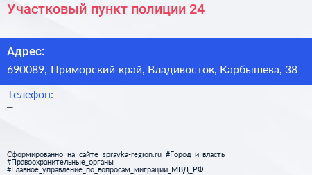 Участковый пункт полиции №24 по адресу 690089, Приморский край, Владивосток, Карбышева, 38 в дальнейшем Организация, размещена в следующих категориях: