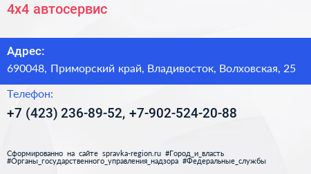 4х4, автосервис по адресу 690048, Приморский край, Владивосток, Волховская, 25 в дальнейшем Организация, размещена в следующих категориях: