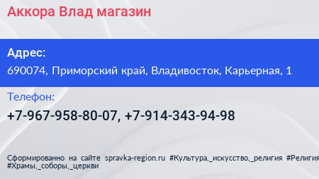 Аккора Влад, магазин по адресу 690074, Приморский край, Владивосток, Карьерная, 1 в дальнейшем Организация, размещена в следующих категориях: