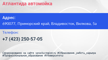 Атлантида, автомойка по адресу 690077, Приморский край, Владивосток, Вилкова, 5а в дальнейшем Организация, размещена в следующих категориях: