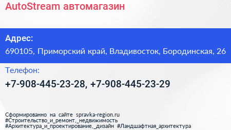 AutoStream, автомагазин по адресу 690105, Приморский край, Владивосток, Бородинская, 26 в дальнейшем Организация, размещена в следующих категориях: