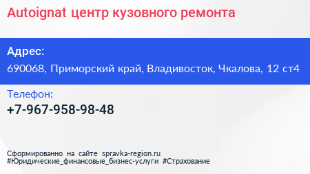 Autoignat, центр кузовного ремонта по адресу 690068, Приморский край, Владивосток, Чкалова, 12 ст4 в дальнейшем Организация, размещена в следующих категориях: