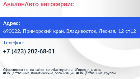 АвалонАвто, автосервис по адресу 690022, Приморский край, Владивосток, Лесная, 12 ст12 в дальнейшем Организация, размещена в следующих категориях: