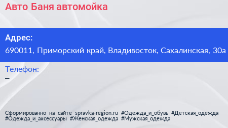 Авто Баня, автомойка по адресу 690011, Приморский край, Владивосток, Сахалинская, 30а в дальнейшем Организация, размещена в следующих категориях:
