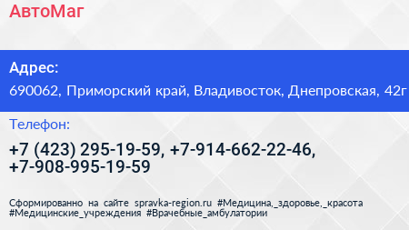 АвтоМаг по адресу 690062, Приморский край, Владивосток, Днепровская, 42г в дальнейшем Организация, размещена в следующих категориях: