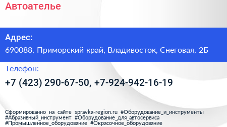 Для связи с организацией воспользуйтесь номером телефона: +7 (423) 290-67-50, +7-924-942-16-19. Пн: c 10:00-18:00, Вт: c 10:00-18:00, Ср: c 10:00-18:00, Чт: c 10:00-18:00, Пт: c 10:00-18:00, Сб: c 10:00-15:00, Вс: выходной, вы можете обратиться в эту организацию.