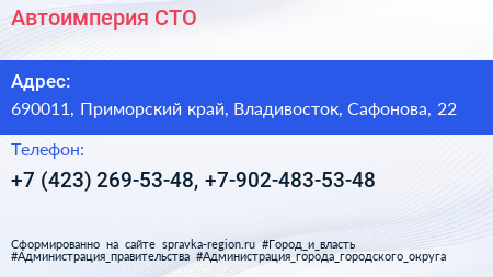 Автоимперия, СТО по адресу 690011, Приморский край, Владивосток, Сафонова, 22 в дальнейшем Организация, размещена в следующих категориях:
