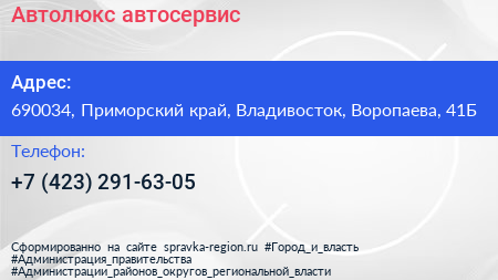 Автолюкс, автосервис по адресу 690034, Приморский край, Владивосток, Воропаева, 41Б в дальнейшем Организация, размещена в следующих категориях: