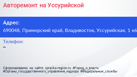Авторемонт на Уссурийской по адресу 690048, Приморский край, Владивосток, Уссурийская, 1 к6 в дальнейшем Организация, размещена в следующих категориях:
