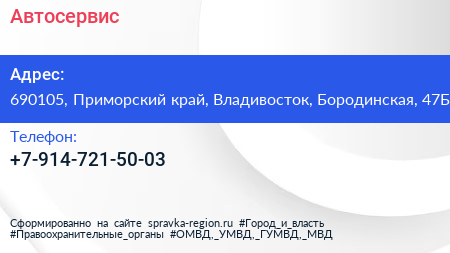 Автосервис по адресу 690105, Приморский край, Владивосток, Бородинская, 47Б в дальнейшем Организация, размещена в следующих категориях: