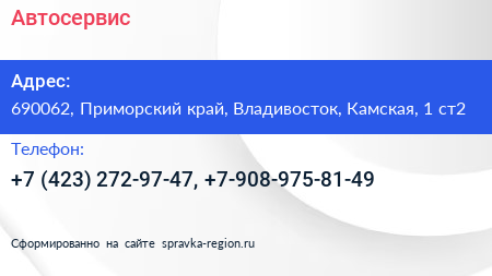 Автосервис по адресу 690062, Приморский край, Владивосток, Камская, 1 ст2 в дальнейшем Организация, размещена в следующих категориях: