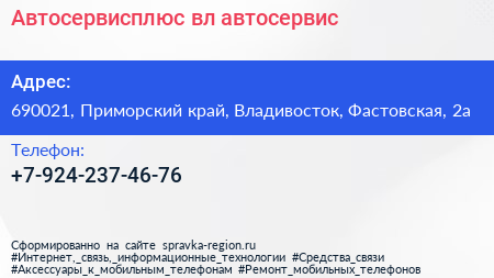 Автосервисплюс вл, автосервис по адресу 690021, Приморский край, Владивосток, Фастовская, 2а в дальнейшем Организация, размещена в следующих категориях: