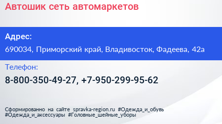 Автошик, сеть автомаркетов по адресу 690034, Приморский край, Владивосток, Фадеева, 42а в дальнейшем Организация, размещена в следующих категориях: