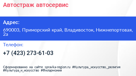 Автостраж, автосервис по адресу 690003, Приморский край, Владивосток, Нижнепортовая, 2а в дальнейшем Организация, размещена в следующих категориях: