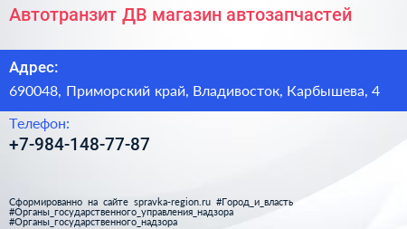 Автотранзит ДВ, магазин автозапчастей по адресу 690048, Приморский край, Владивосток, Карбышева, 4 в дальнейшем Организация, размещена в следующих категориях: