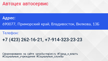 Автоцех, автосервис по адресу 690077, Приморский край, Владивосток, Вилкова, 13Б в дальнейшем Организация, размещена в следующих категориях: