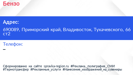 Бензо по адресу 690089, Приморский край, Владивосток, Тухачевского, 66 ст2 в дальнейшем Организация, размещена в следующих категориях: