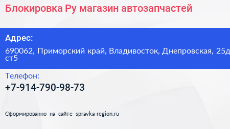 Блокировка.Ру, магазин автозапчастей по адресу 690062, Приморский край, Владивосток, Днепровская, 25д ст5 в дальнейшем Организация, размещена в следующих категориях: