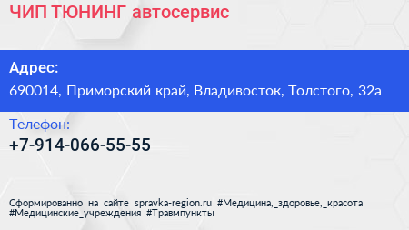 ЧИП ТЮНИНГ, автосервис по адресу 690014, Приморский край, Владивосток, Толстого, 32а в дальнейшем Организация, размещена в следующих категориях: