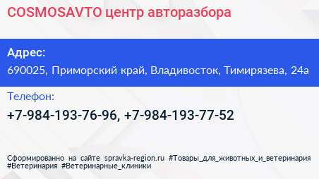 COSMOSAVTO, центр авторазбора по адресу 690025, Приморский край, Владивосток, Тимирязева, 24а в дальнейшем Организация, размещена в следующих категориях: