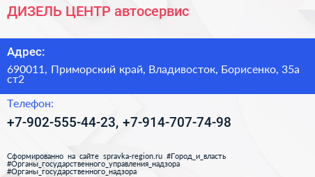 ДИЗЕЛЬ ЦЕНТР, автосервис по адресу 690011, Приморский край, Владивосток, Борисенко, 35а ст2 в дальнейшем Организация, размещена в следующих категориях: