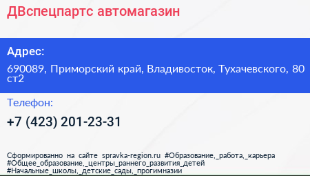 ДВспецпартс, автомагазин по адресу 690089, Приморский край, Владивосток, Тухачевского, 80 ст2 в дальнейшем Организация, размещена в следующих категориях: