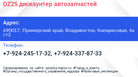 DZ25, дискаунтер автозапчастей по адресу 690017, Приморский край, Владивосток, Кипарисовая, 4а ст2 в дальнейшем Организация, размещена в следующих категориях: