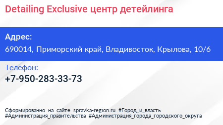 Detailing Exclusive, центр детейлинга по адресу 690014, Приморский край, Владивосток, Крылова, 10/6 в дальнейшем Организация, размещена в следующих категориях: