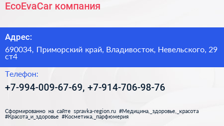EcoEvaCar, компания по адресу 690034, Приморский край, Владивосток, Невельского, 29 ст4 в дальнейшем Организация, размещена в следующих категориях: