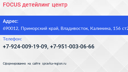 FOCUS, детейлинг-центр по адресу 690012, Приморский край, Владивосток, Калинина, 156 ст2 в дальнейшем Организация, размещена в следующих категориях: