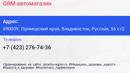 GRM, автомагазин по адресу 690039, Приморский край, Владивосток, Русская, 16 ст2 в дальнейшем Организация, размещена в следующих категориях: