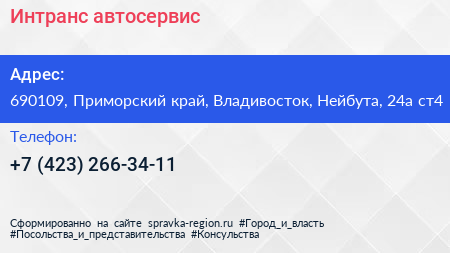 Интранс, автосервис по адресу 690109, Приморский край, Владивосток, Нейбута, 24а ст4 в дальнейшем Организация, размещена в следующих категориях: