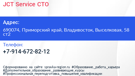 JCT Service, СТО по адресу 690074, Приморский край, Владивосток, Выселковая, 58 ст2 в дальнейшем Организация, размещена в следующих категориях: