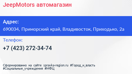 JeepMotors, автомагазин по адресу 690034, Приморский край, Владивосток, Приходько, 2а в дальнейшем Организация, размещена в следующих категориях: