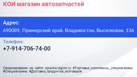 КОИ, магазин автозапчастей по адресу 690089, Приморский край, Владивосток, Выселковая, 136 в дальнейшем Организация, размещена в следующих категориях: