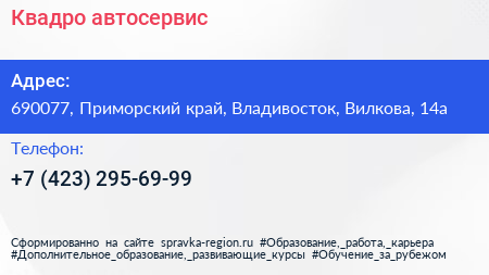 Квадро, автосервис по адресу 690077, Приморский край, Владивосток, Вилкова, 14а в дальнейшем Организация, размещена в следующих категориях: