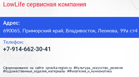 LowLife, сервисная компания по адресу 690065, Приморский край, Владивосток, Леонова, 99а ст4 в дальнейшем Организация, размещена в следующих категориях:
