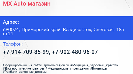 MX Auto, магазин по адресу 690074, Приморский край, Владивосток, Снеговая, 18а ст14 в дальнейшем Организация, размещена в следующих категориях: