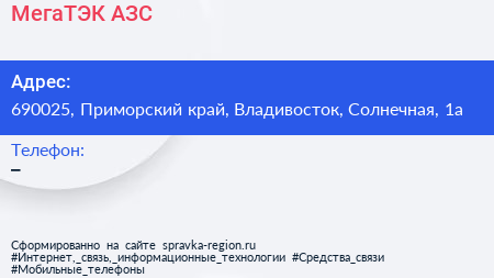 МегаТЭК, АЗС по адресу 690025, Приморский край, Владивосток, Солнечная, 1а в дальнейшем Организация, размещена в следующих категориях: