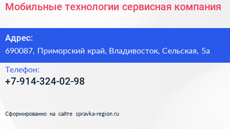Мобильные технологии, сервисная компания по адресу 690087, Приморский край, Владивосток, Сельская, 5а в дальнейшем Организация, размещена в следующих категориях:
