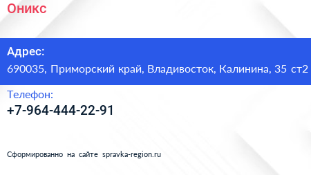 Оникс по адресу 690035, Приморский край, Владивосток, Калинина, 35 ст2 в дальнейшем Организация, размещена в следующих категориях: