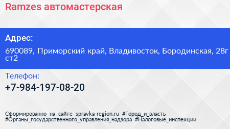 Ramzes, автомастерская по адресу 690089, Приморский край, Владивосток, Бородинская, 28г ст2 в дальнейшем Организация, размещена в следующих категориях: